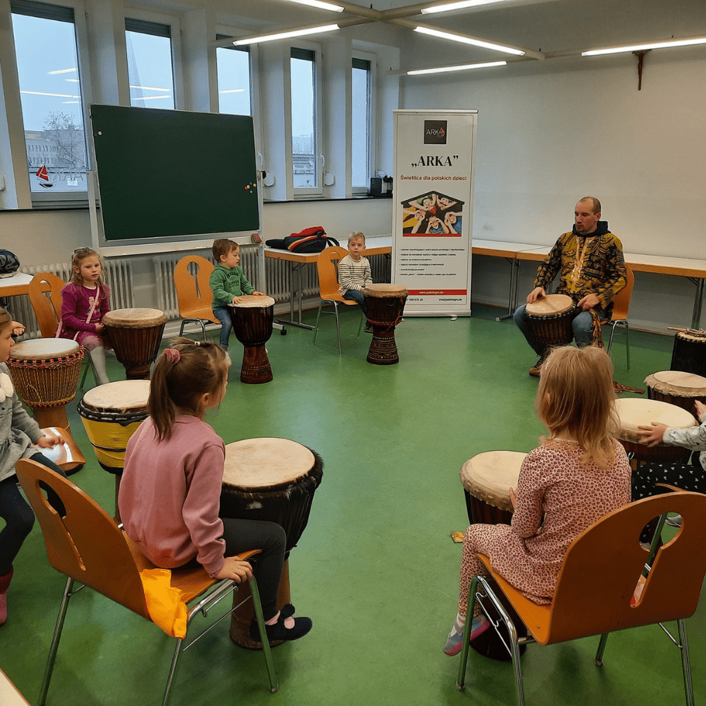 Dzieci, które wzięły udział w warsztatach miały możliwość posłuchać trochę o bębenkach i poznać techniki grania. Każde dziecko z chęcią spróbowało swoich sił w tej nowej dla siebie dziedzinie. I chociaż dla większości dzieci było to pierwsze takie spotkanie z bębnami, już teraz widać ogromny potencjał!