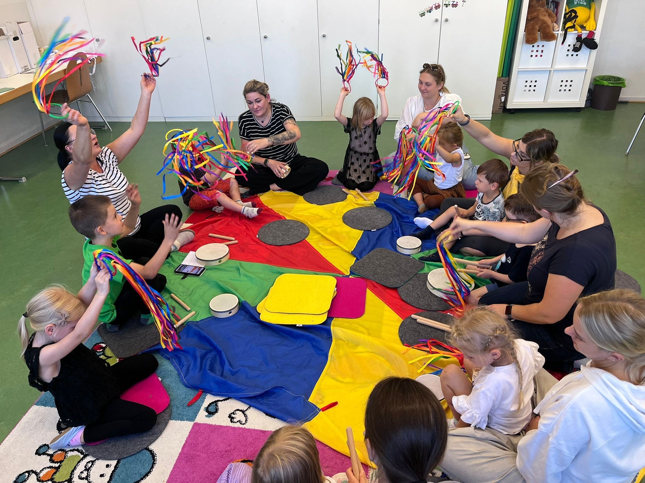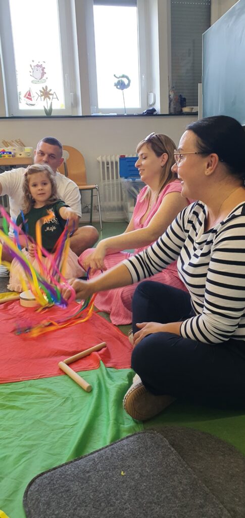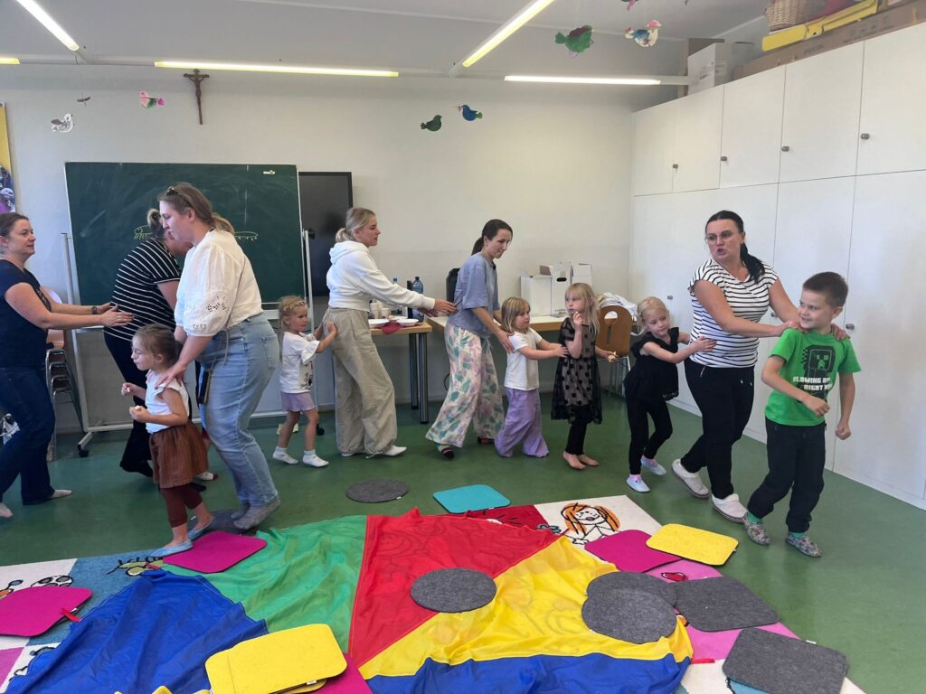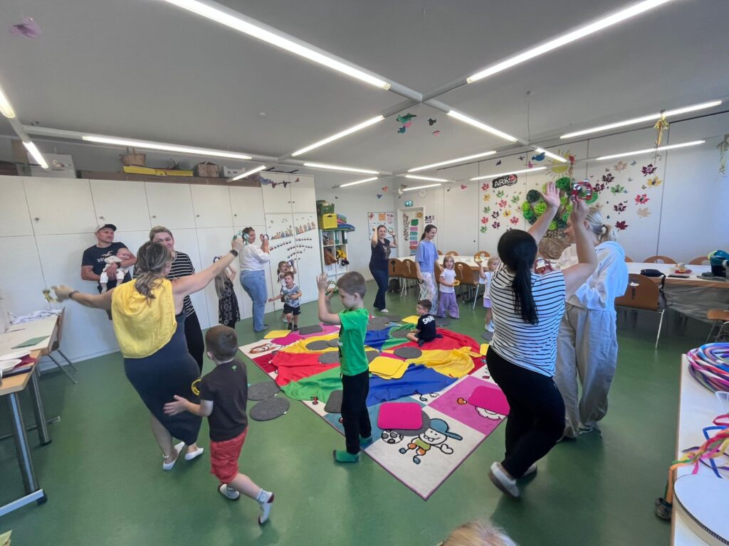 Podczas zajęć na kolorowym dywanie z wesołymi zwierzakami dzieci ćwiczyły koordynację, rozwijały wyobraźnię i budowały relacje z rówieśnikami. Wspólne zabawy z dorosłymi pokazały, jak ważna jest bliskość i zaangażowanie w procesie edukacyjnym.
